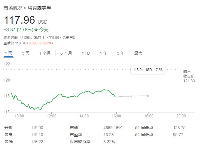 由于财报公布后盈利未达预期,周五埃克森美孚的股价一度跌超 3%。